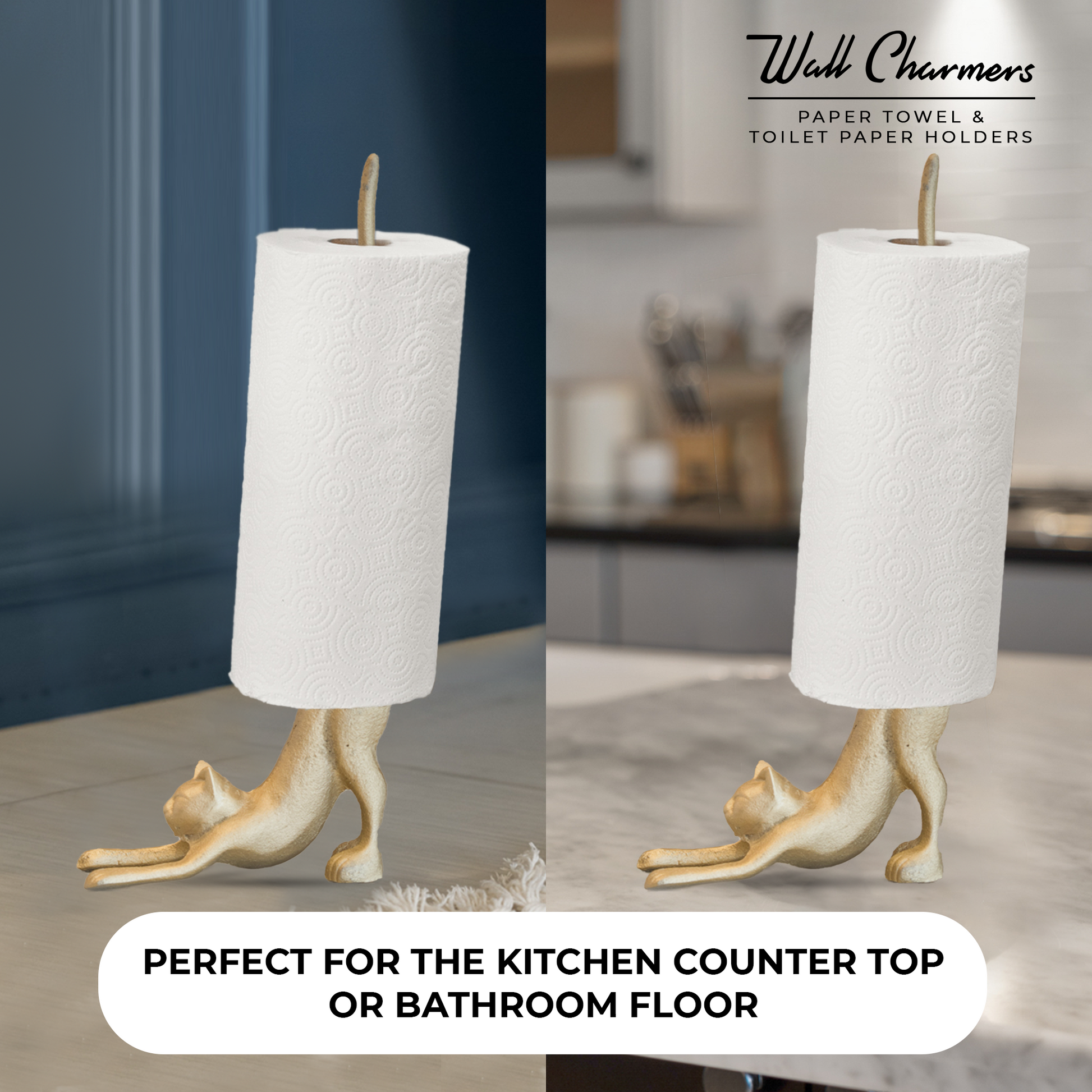 Add some whimsy to your decor with this Cast Iron Gold Cat Paper Towel Holder. It is as adorable as it is functional! Use it as a Paper Towel Holder in the kitchen or, to store extra toilet paper rolls in the bathroom! It's perfect for whichever room you choose! The rolls slide easily onto the tail.