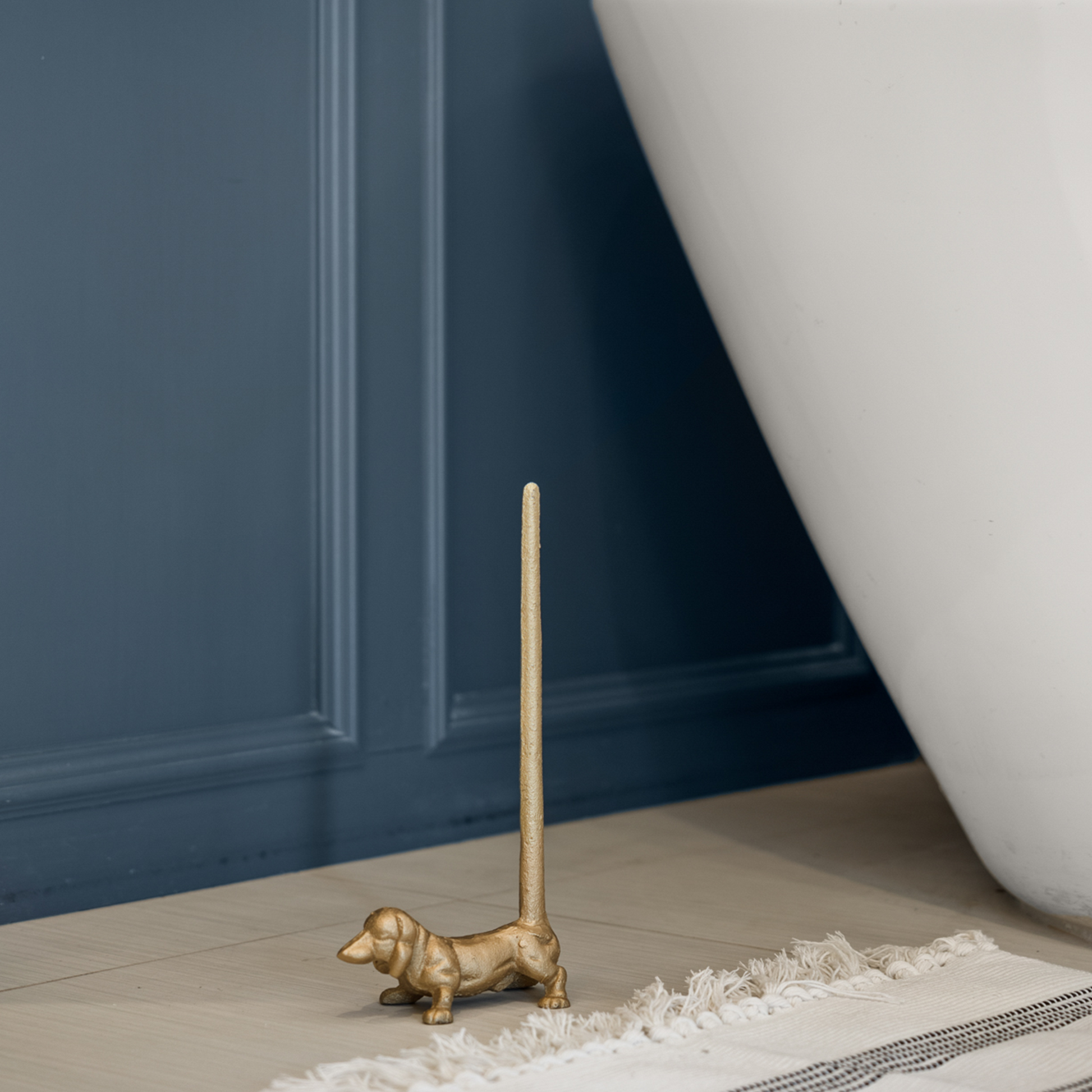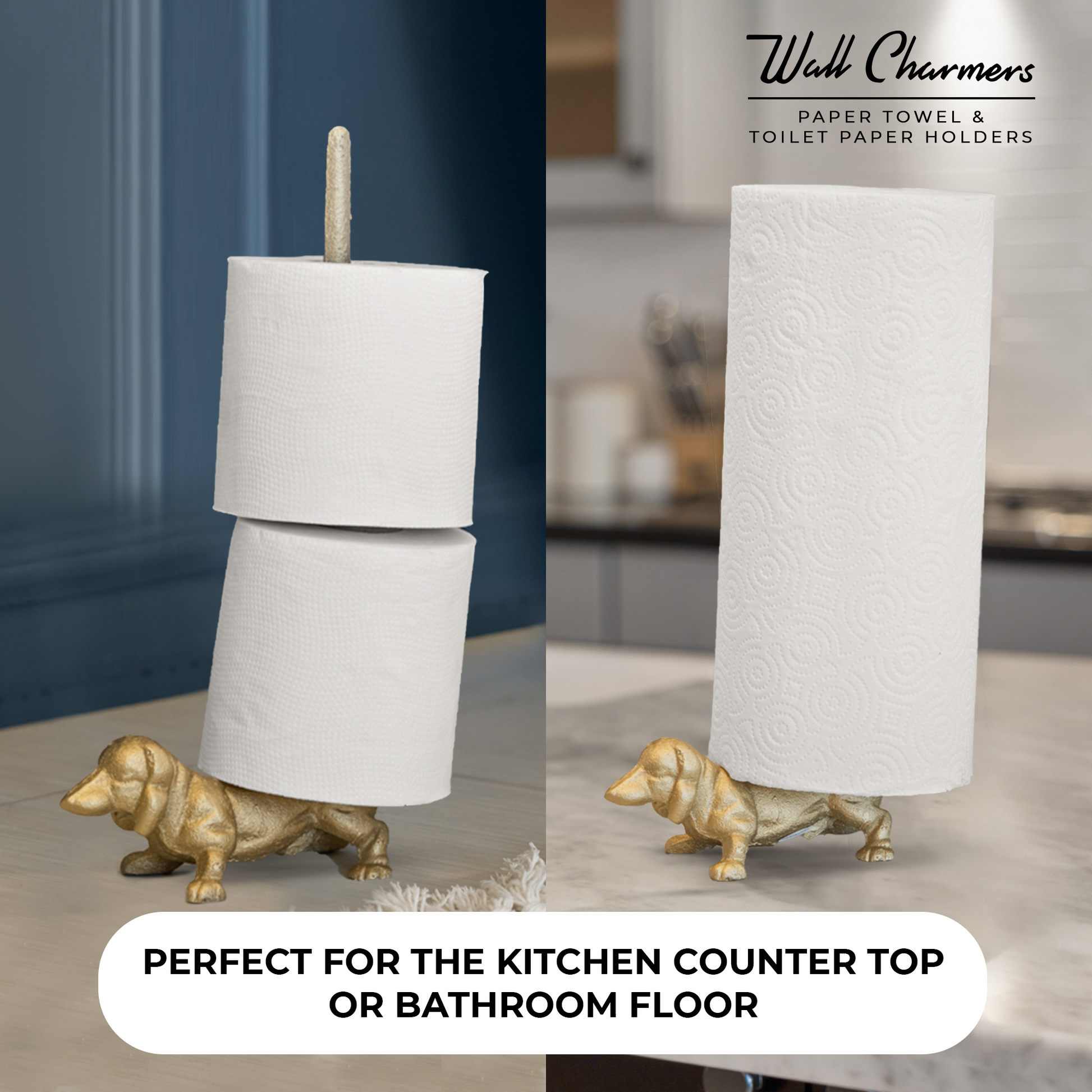 Looking for a fun, whimsical piece of decor for your kitchen? This Cast Iron Gold Dacshund Paper Towel Holder is as adorable as it is functional! Use it as a Paper Towel Holder in the kitchen or, to store extra toilet paper rolls in the bathroom! It's perfect for whichever room you choose!The rolls slide easily onto the tail.